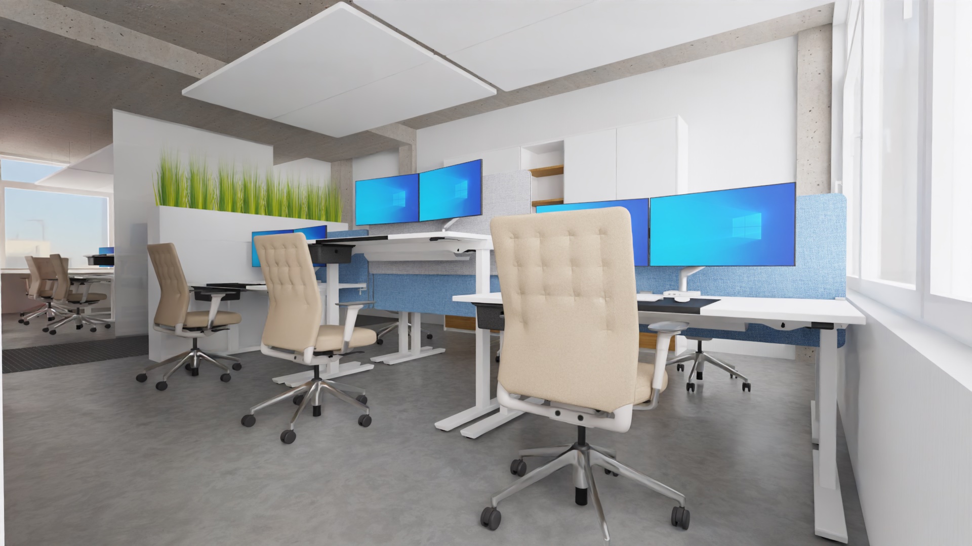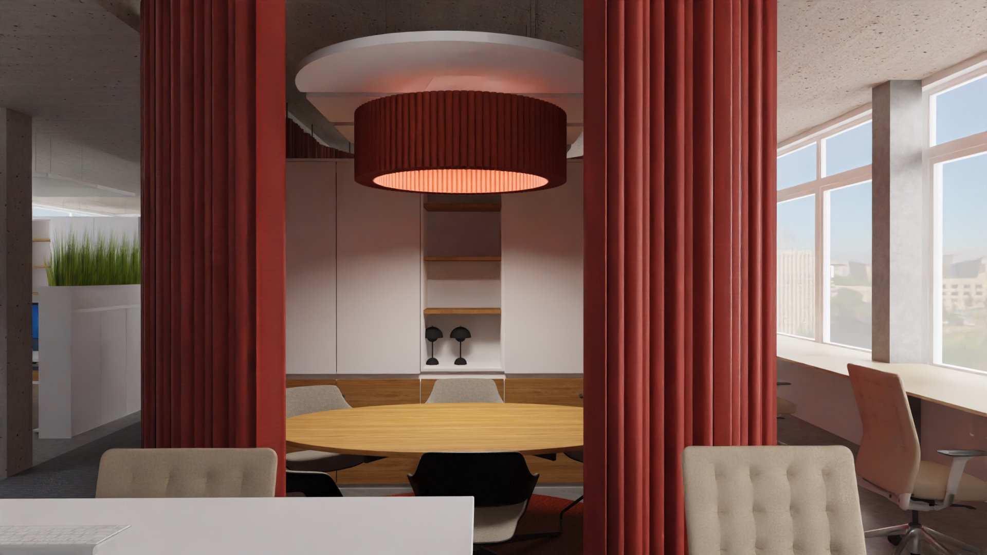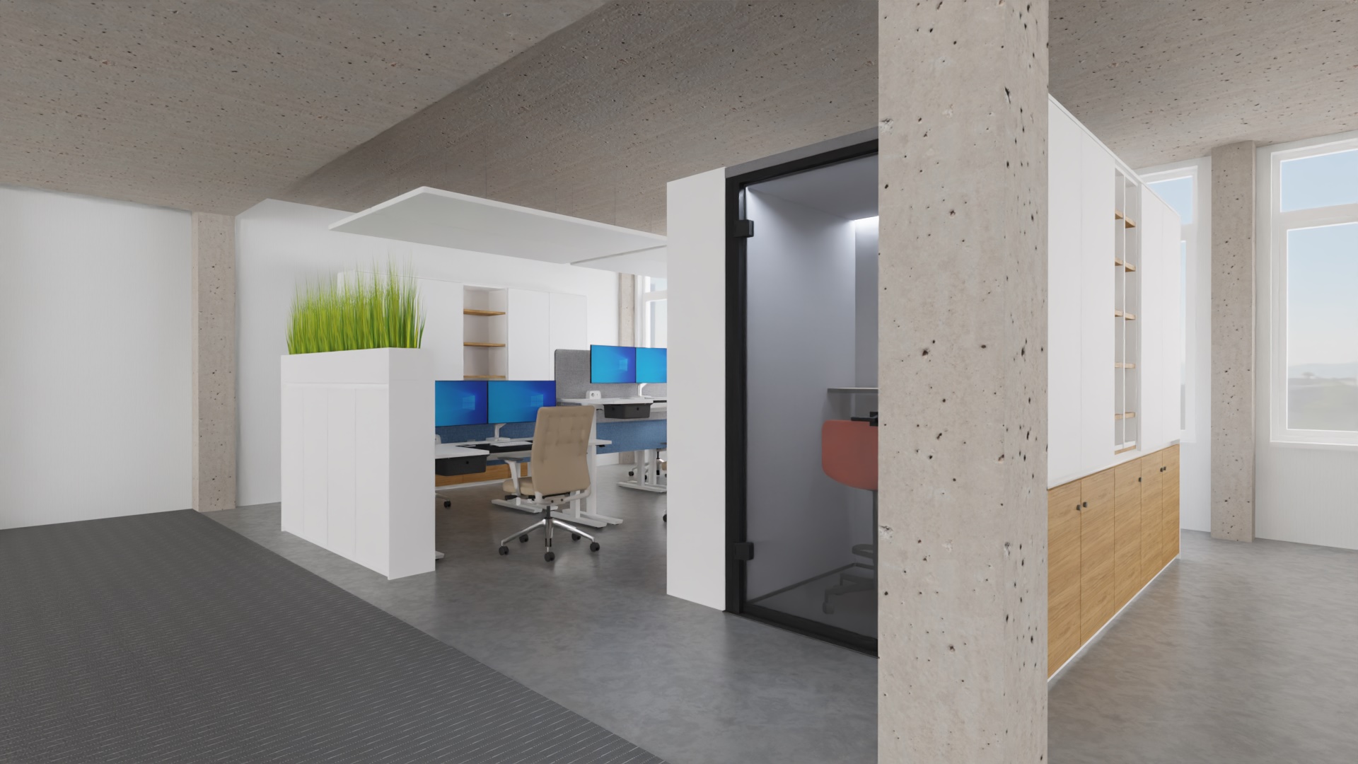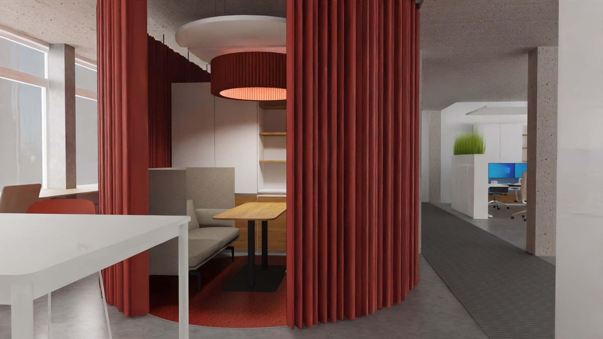 L’acoustique a fait l’objet d’une attention toute particulière. Des panneaux au plafond, des cloisons textiles et des matériaux absorbants ciblés ont permis de réduire la réverbération et d’améliorer l’intelligibilité de la parole.