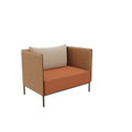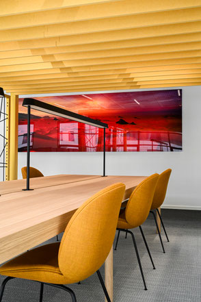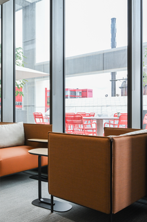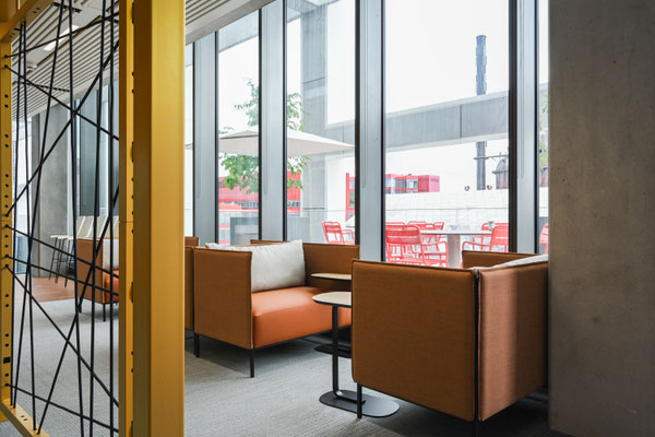 En bordure, les lounges aux accents rouge acier dialoguent avec l’extérieur et les hauts fourneaux