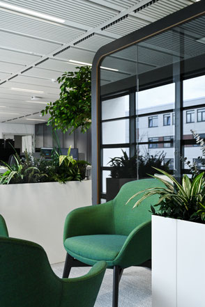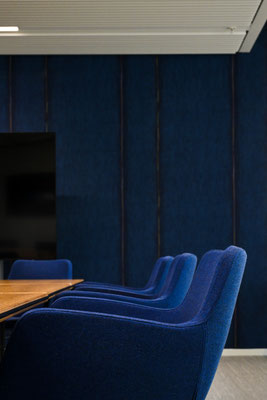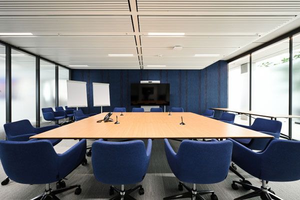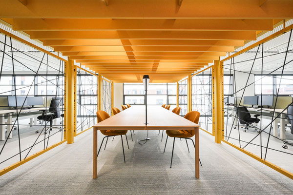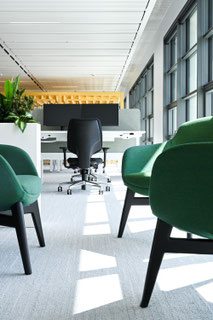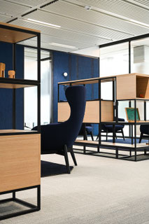 Les espaces collaboratifs prennent ensuite le relais. Mêlant vert-de-gris et bleu de travail, ils traduisent une volonté d’efficacité et de coopération. On y trouve les cabines acoustiques, des salles de réunion allant du formel à l’informel, mais aussi des zones ouvertes de type breakout zone qui favorisent les échanges en mouvement.