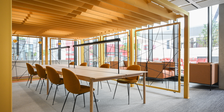 Le parcours commence donc aux extrémités du plateau avec deux grandes cafétérias baignées de jaune. Pensées comme des respirations dans le quotidien, elles offrent un propice aux échanges spontanés et à la circulation libre des idées.